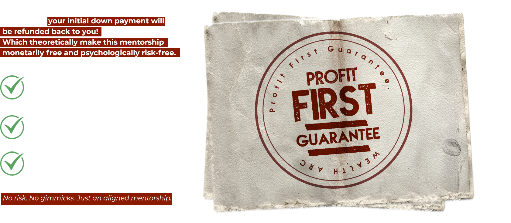 Make more money than what’s owed in net profit within 12 months while following the plan (calls, journaling, risk rules), and we refund your down payment!