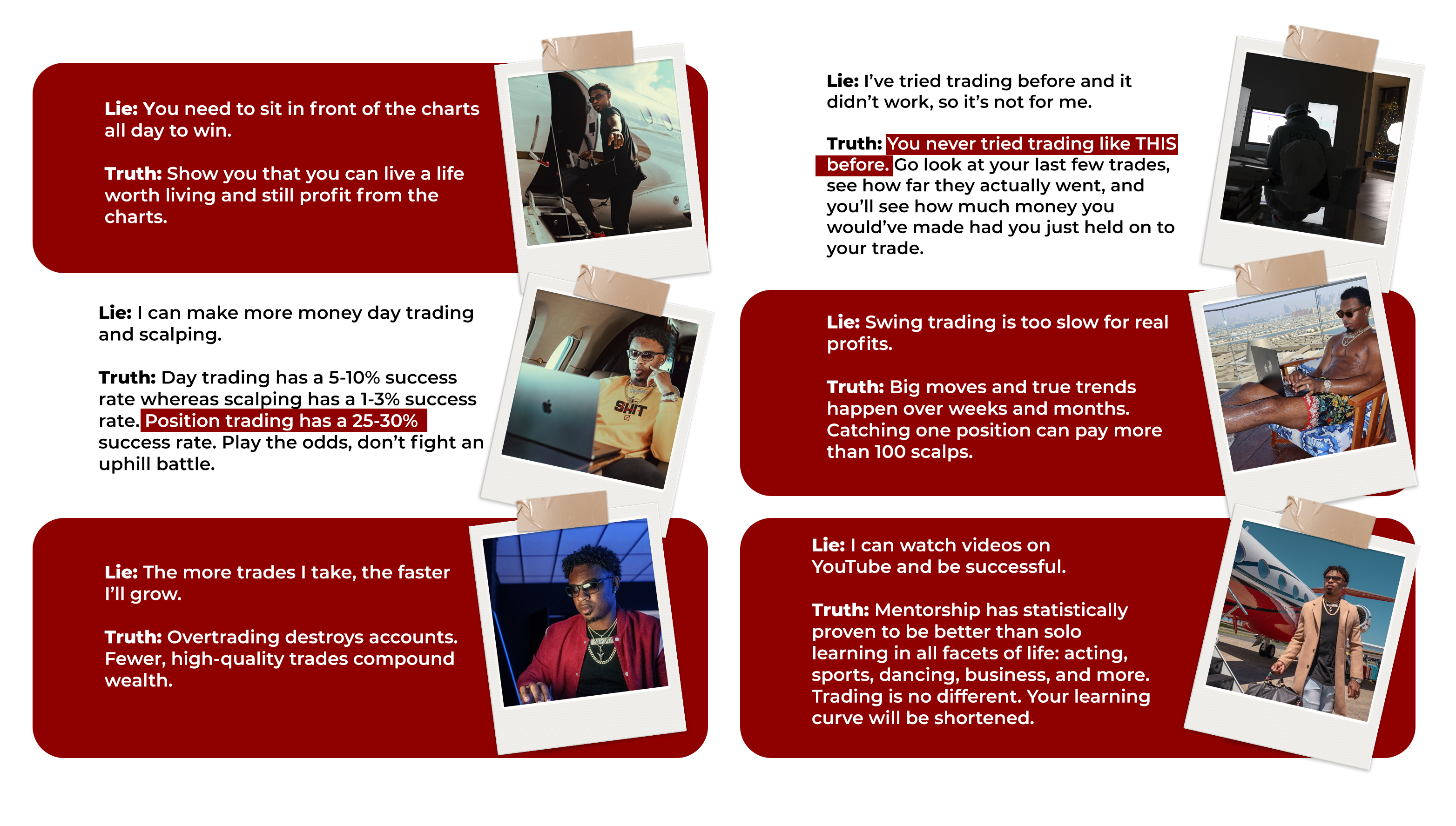 Long gone are the days of not having anyone to personally help you. Never feel lost again as you’ll have a mentor coaching you, breaking down your trades, and correcting mistakes.