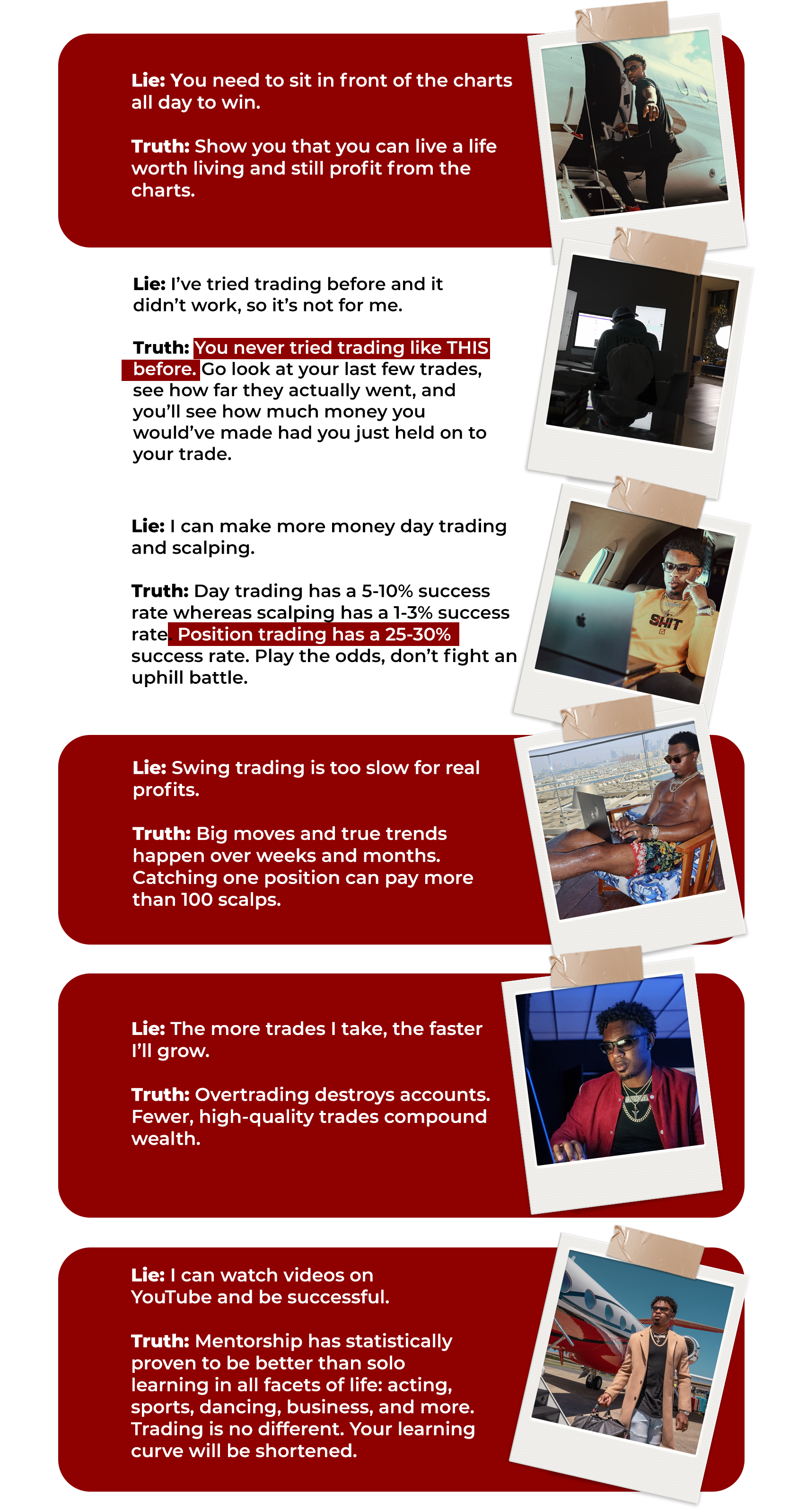 The first mentorship of its kind, a true partnership where your wins are our wins. You only put down your initial payment today, and nothing else is owed until I help you make that money back, and more! No monthly fees. No hidden charges. Just clear results. We trade together, learn together, and grow together.